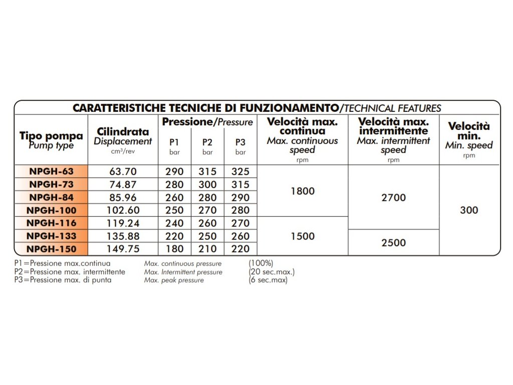 Volumetrický objem čerpadla je od 63l. Čerpadlo má příruby na 4 díry a hřídel s rychloupínací spojku SAE 1”3/8 DIN 9611 uloženou ve dvou ložiscích.