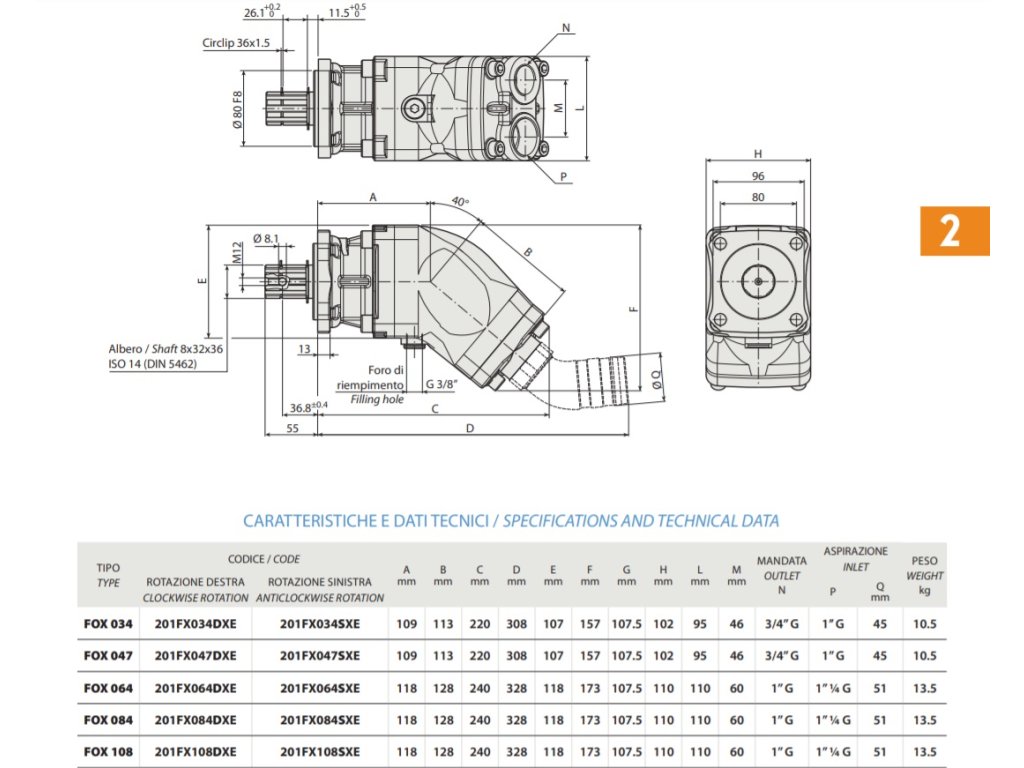 Serie FOX je v objemu 34 až 108L /min. Maximální povolené otáčky jsou 1500-2300ot/min. Pracovní tlak 350-450 Bar.