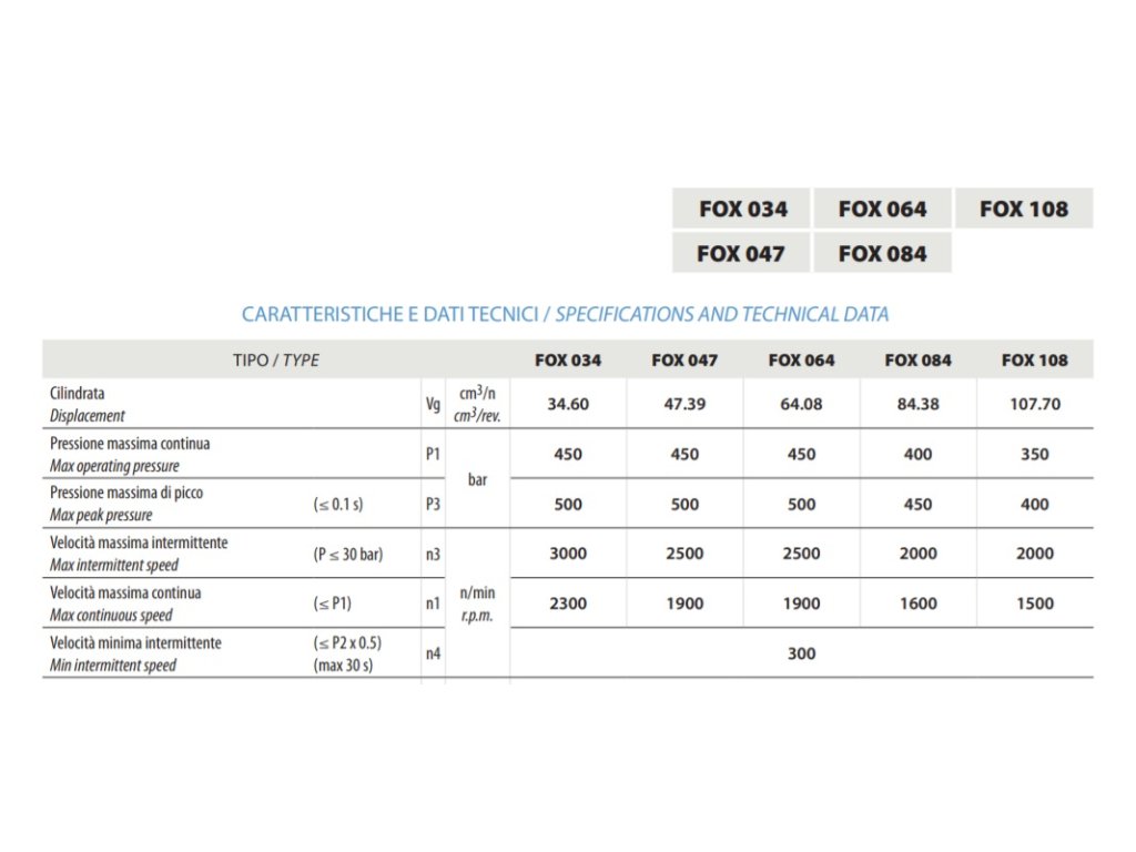 Serie FOX je v objemu 34 až 108L /min. Maximální povolené otáčky jsou 1500-2300ot/min. Pracovní tlak 350-450 Bar.
