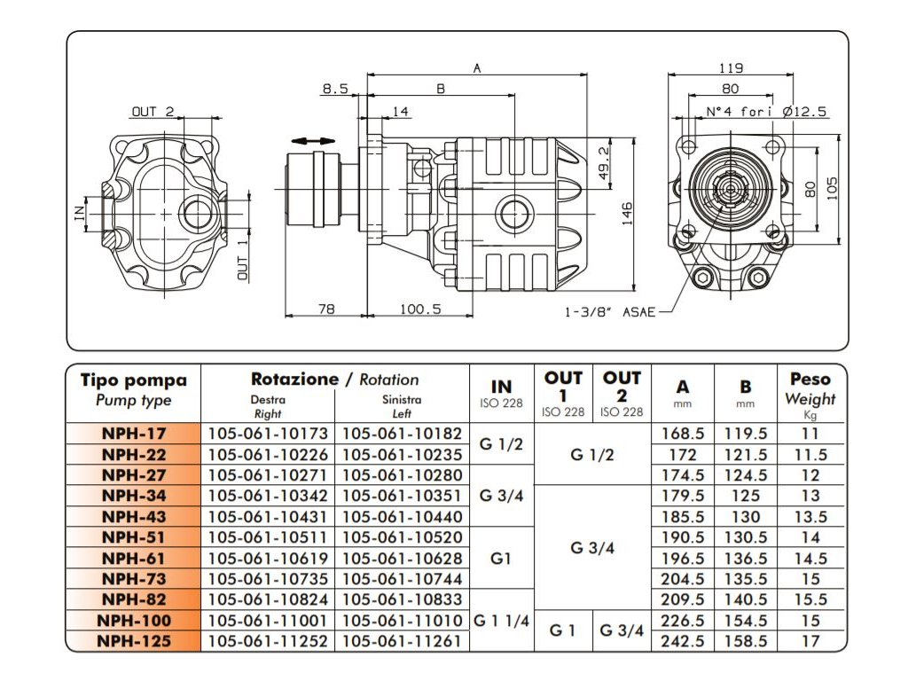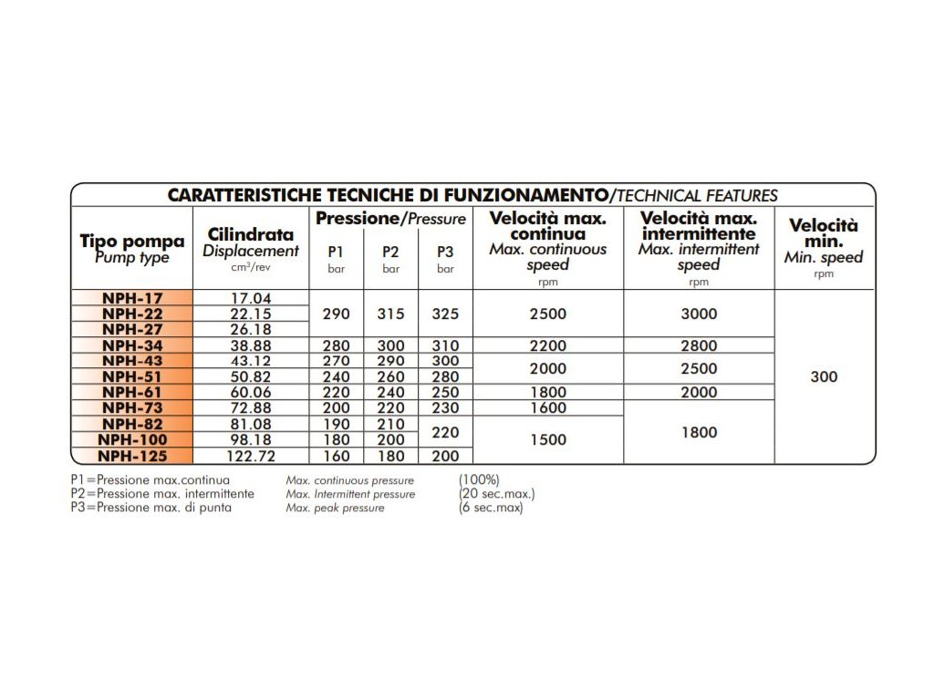 Volumetrický objem čerpadla je od 65l. Čerpadlo má příruby na 4 díry a hřídel s rychloupínací spojku SAE 1”3/8 DIN 9611 uloženou ve dvou ložiscích.