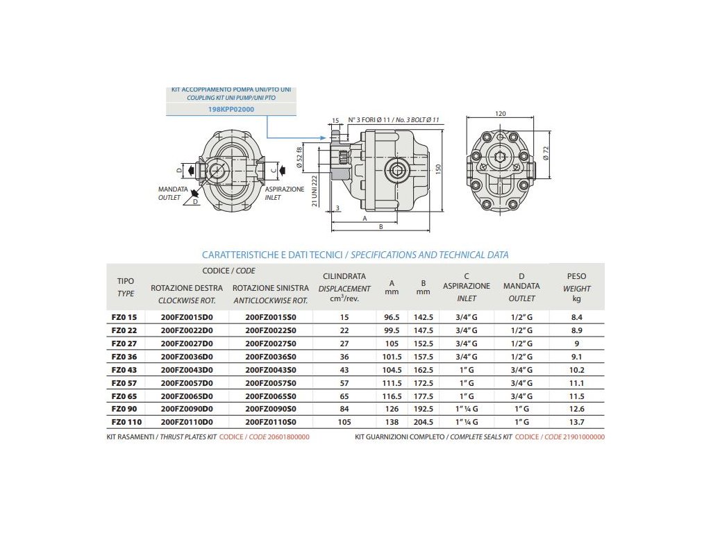 Zubová olejová čerpadla řady FZ0 jsou jednosměrná UNI čerpadla určená pro montáž na 3dírovou přírubu UNI 21-222 se 7mi drážkovou hřídelí o rozměrech 7x21x25mm.